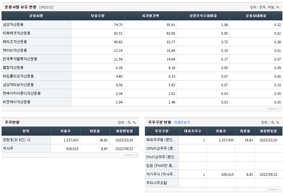 단기 매매라면 주주현황 정보가 필요없지만, 장기적으로 회사 자산을 찾고 분석한다면 경영진의 비전과 역량도 살펴봐야 한다. 대주주들을 직접 만날 수는 없지만, 그들이 어떻게 뭉치는지 보는 것은 좋다.