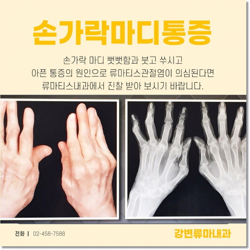 손가락 관절 통증과 같은 관절 사이의 통증으로 잠 못 이루는 자가면역질환인 류마티스관절염은 전체 성인 인구의 0.8%가 앓고 있는 것으로 알려져 있다. 우리나라는 1% 미만으로 추정된다고 하는데 100명 중 1명이 류마티스관절염을 앓고 있다는 사실을 알려드립니다.류마티스 관절염의 원인