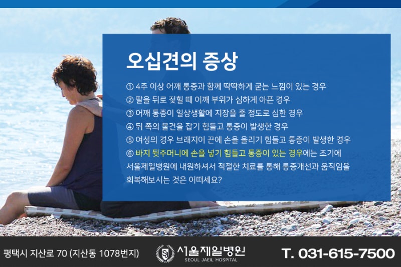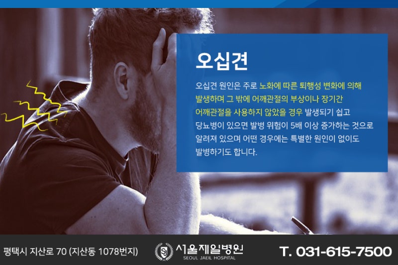 티셔츠를 입고 벗는 행동이 어렵거나 머리를 빗을 때, 높은 곳에 있는 것을 꺼낼 때 불편함을 느낀다면 의료진을 찾아야 합니다. 오십견은 어깨 관절을 보호하는 관절낭이 유착되어 생기는 문제인데 어깨 운동이 어려워지면서 다소 불안정한 상태가 될 수 있었습니다. 관절낭에 염증이 생겨 유착이 진행되면 통증을 느끼게 되고 운동 범위 제한이 나타납니다.