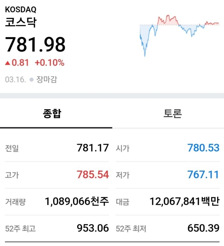 종가지수: 코스닥 781.98P (+0.81P/+0.10%).