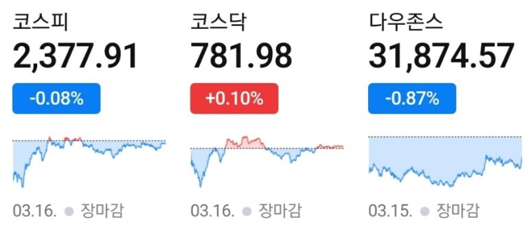 3/16 KOSPI 2,377.91 (-0.08%) CS 유동성 우려 및 미국 SVB 파산 여파 지속(-), 스위스 당국 CS 지원 소식(+)